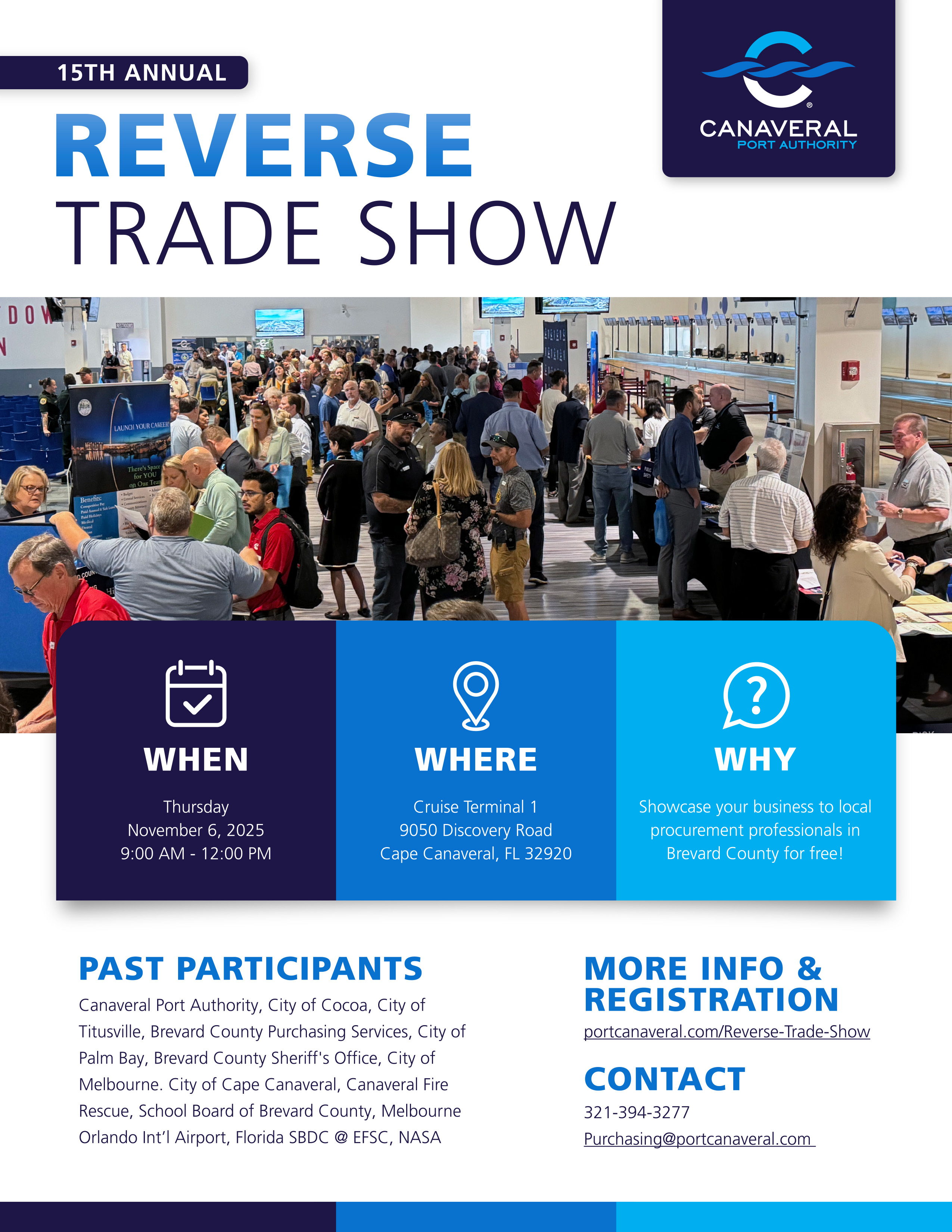 Attention local businesses! Save the date—Thursday, November 6, 2025—for the Canaveral Port Authority's Annual Reverse Trade Show! This free event is a prime opportunity to connect with purchasing professionals seeking diverse goods and services, from MRO supplies to construction and consulting. Unlike traditional trade shows, government agencies will be the exhibitors, and vendors can visit their tables, presenting products and services directly to decision-makers. Don’t miss this valuable chance to grow your business!